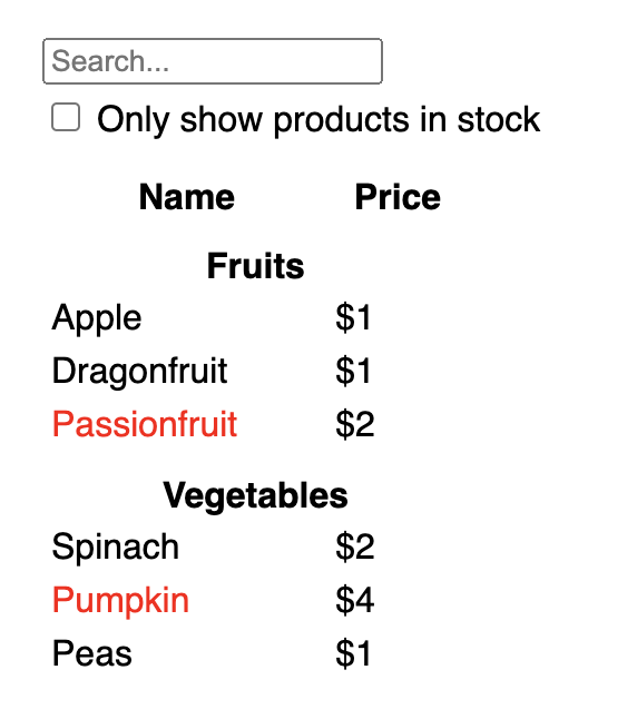 [ { category: "Fruits", price: "$1", stocked: true, name: "Apple" }, { category: "Fruits", price: "$1", stocked: true, name: "Dragonfruit" }, { category: "Fruits", price: "$2", stocked: false, name: "Passionfruit" }, { category: "Vegetables", price: "$2", stocked: true, name: "Spinach" }, { category: "Vegetables", price: "$4", stocked: false, name: "Pumpkin" }, { category: "Vegetables", price: "$1", stocked: true, name: "Peas" } ]